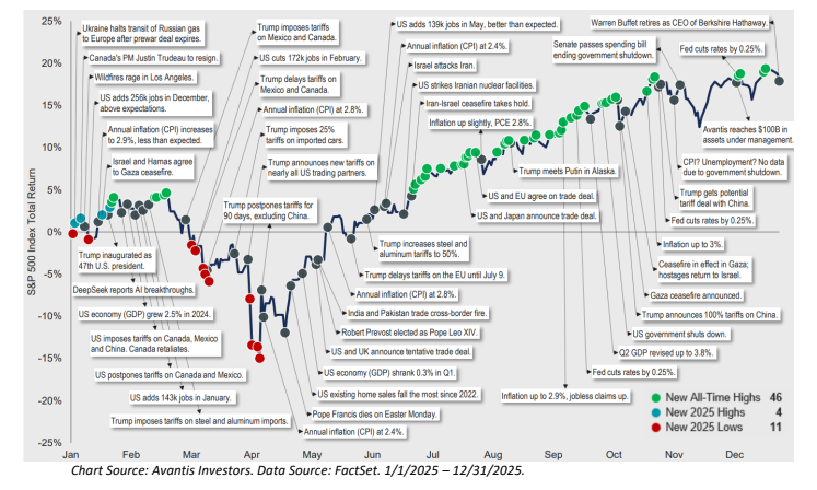 If an investor had stepped away from their portfolio statements in 2025 and relied solely on headlines, it would have been difficult, if not impossible, to imagine that the year would ultimately be remembered as a strong one for markets. The news cycle offered no shortage of reasons to worry: geopolitical conflict, renewed trade tensions and tariffs, government shutdowns, inflation scares, abrupt reversals in policy guidance, and persistent anxiety about the global economy. On several occasions, markets experienced sharp and unsettling drawdowns that felt, in the moment, like the start of something far worse. And yet, once again, financial markets demonstrated their remarkable ability to advance in spite of this chaos.