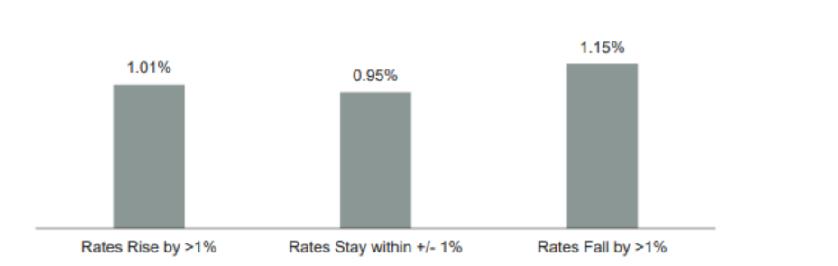 Chart source: Avantis Investors. Data from 1973 – 2024. U.S. stocks the Market Portfolio from Ken French’s Data Library. The total rolling one-year periods in the analysis are 613. Total rolling 1-year periods when rates rise by >1% are 93, periods when rates fall by >1% are 93, and periods when rates stay within +/- 1% are 410.